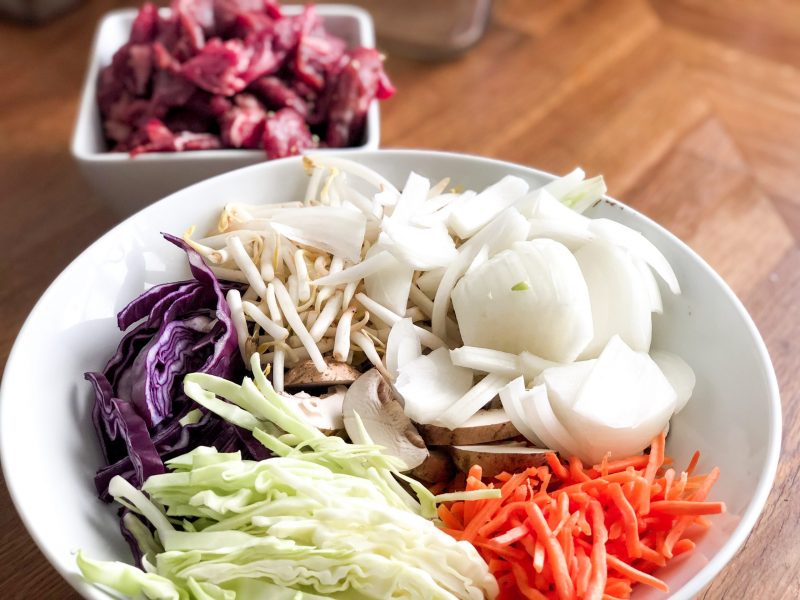 - Place vegetables and steak in a bowl. Serve with a side of kimchi for extra heat and flavor.