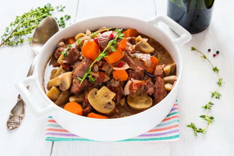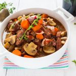- Put all remaining ingredients into Slow Cooker, except mushrooms. Cover and cook until the meat and vegetables are tender, which takes about 6 hours on high heat.