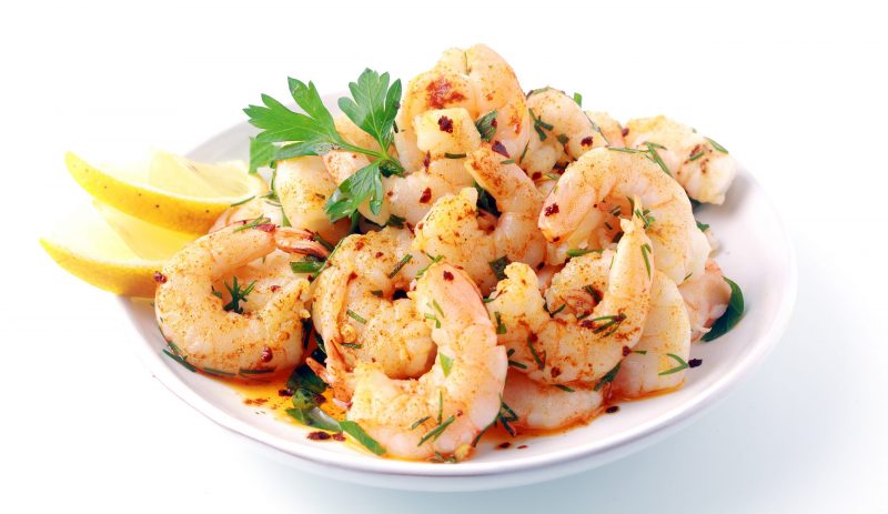 - Remove shrimp from oven and squeeze the juice from the two lemon wedges over the dish. Serve hot.