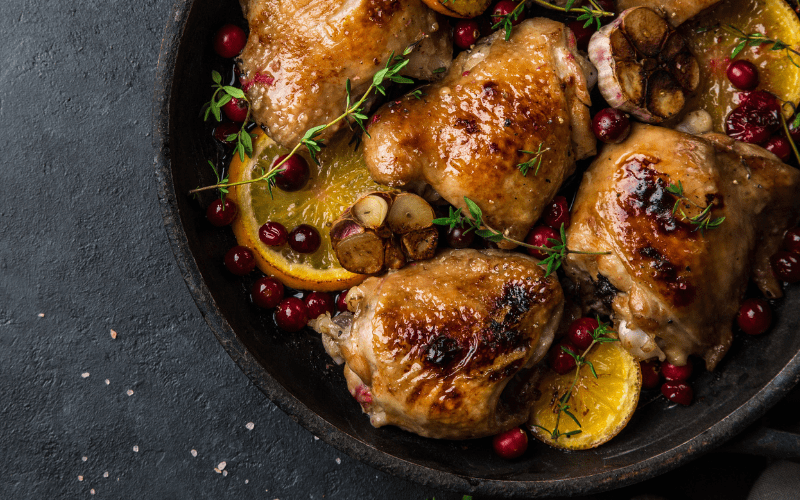 - Place the chicken, onions, celery, lemon halves and any liquid from the marinade in a baking pan (lightly oiled or lined). Add bone broth/chicken broth, then add the "sugared" cranberries.