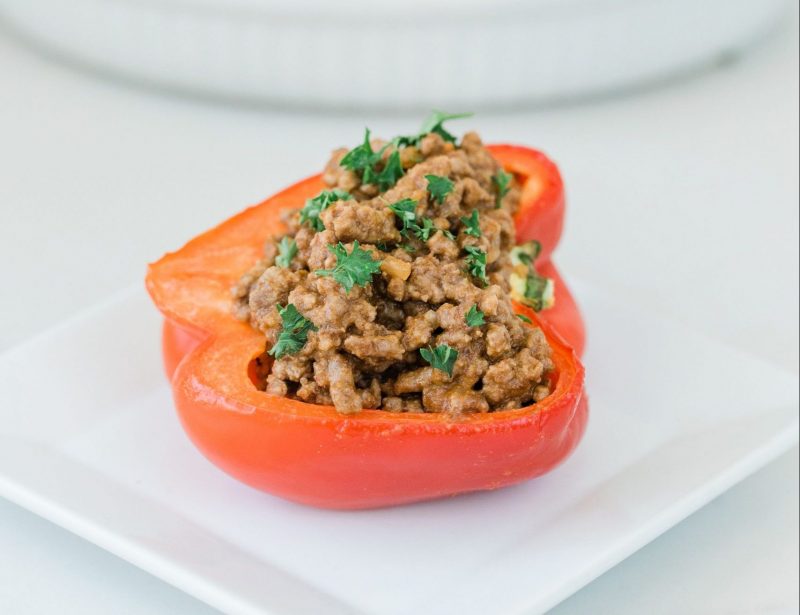 - Fill each pepper with the meat mixture, put the tops of the peppers on, and place in the oven.